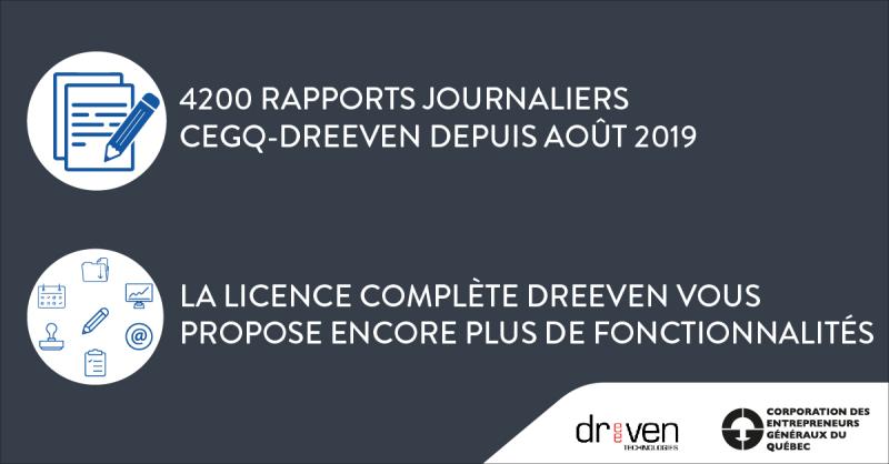 Many users have also chosen the full license of Dreeven Technologies Inc. which offers many more advanced features, that allow you to manage documents and contracts, collaborators, change requests, annotations on plans, financial risk, denunciations, requests and approvals, emails, the tendering process and site meetings. The CEGQ is proud to offer free daily reports to its members, as well as a preferential rate for the full license. Support for migration and technical assistance is also included.